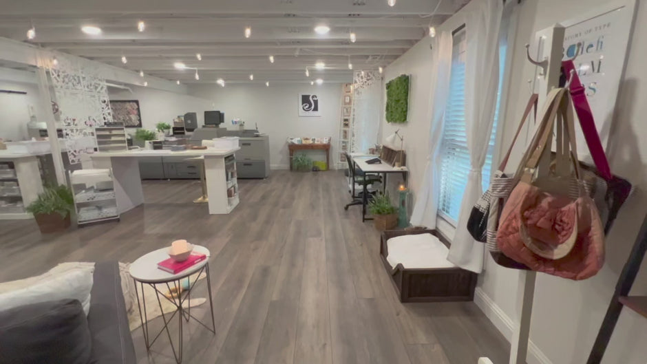 This is where the magic happens! Our studio is filled with colorful paper, envelopes, embellishments and more for our unique invitation designs.