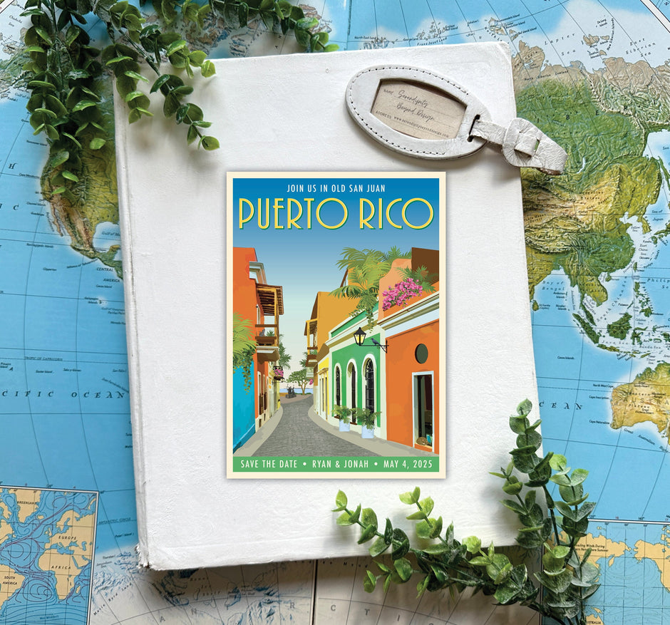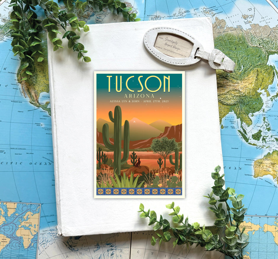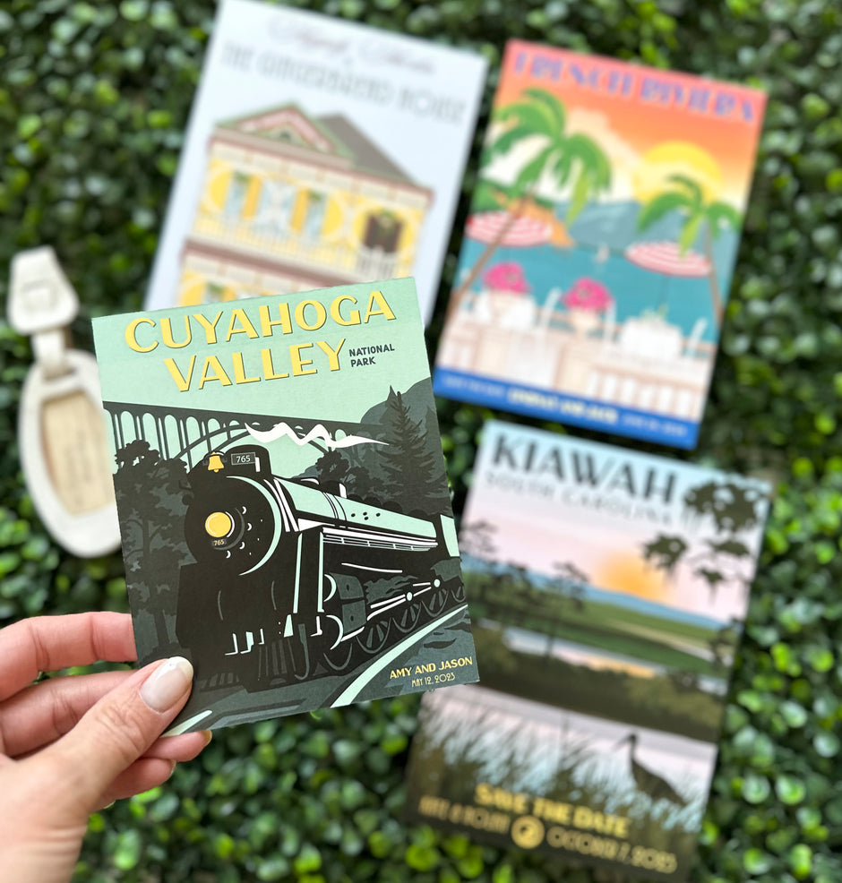 At Serendipity, we have a serious obsession with all things vintage—maps, stamps, antiqued textures, and especially retro travel postcards. It’s only fitting that our wedding clients often request a custom travel poster inspired by their venue. Simply provide one or two reference images, and we’ll create a vector, retro-inspired travel poster designed to be incorporated into your stationery suite. You’ll also receive a high-resolution file to print and enjoy as a keepsake long after the celebration. Looking for a one-of-a-kind gift or personal memento? Custom posters are available on their own as well.